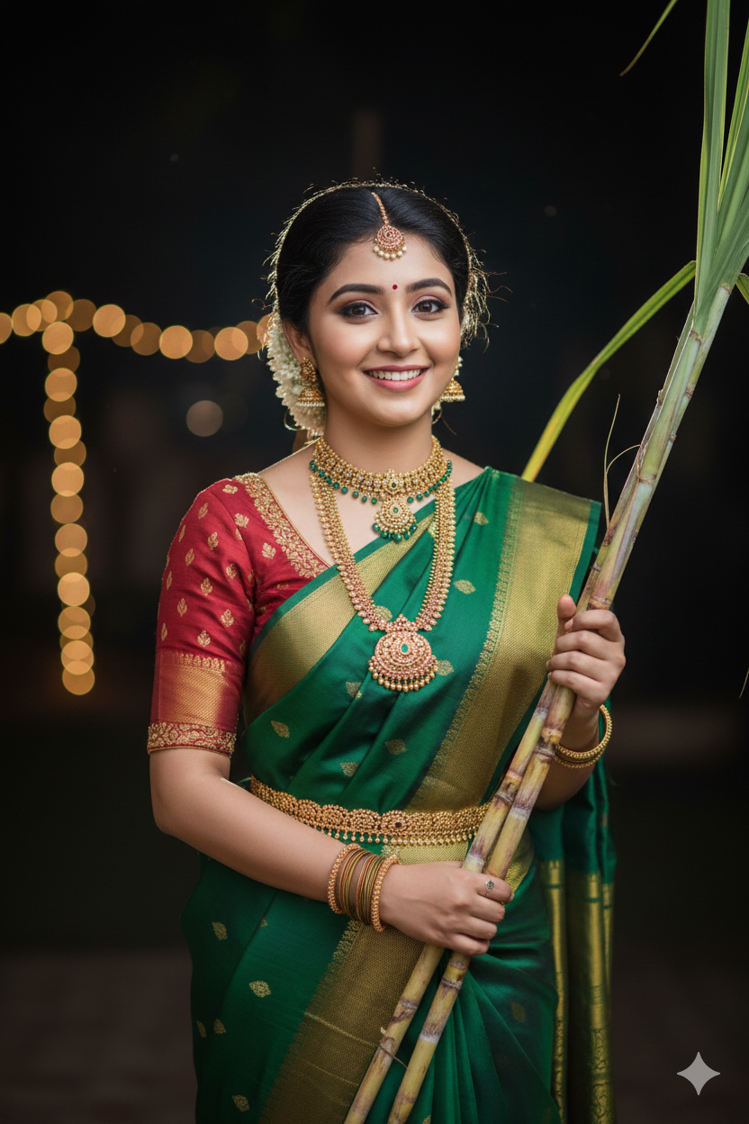 Emerald Harvest – South Indian Pongal Night Portrait-gemini ai prompts